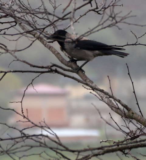 Su di un ramo di un'acacia (cassiaru) si è da poco posata per qualche istante questa splendida... pensavo fosse una gazza ladra(carcarazza) e invece ho trovato che è una cornacchia grigia, estremamente comune, ma che io non avevo ancora visto. Sullo sfondo Piscopio. (Battista Bartalotta)